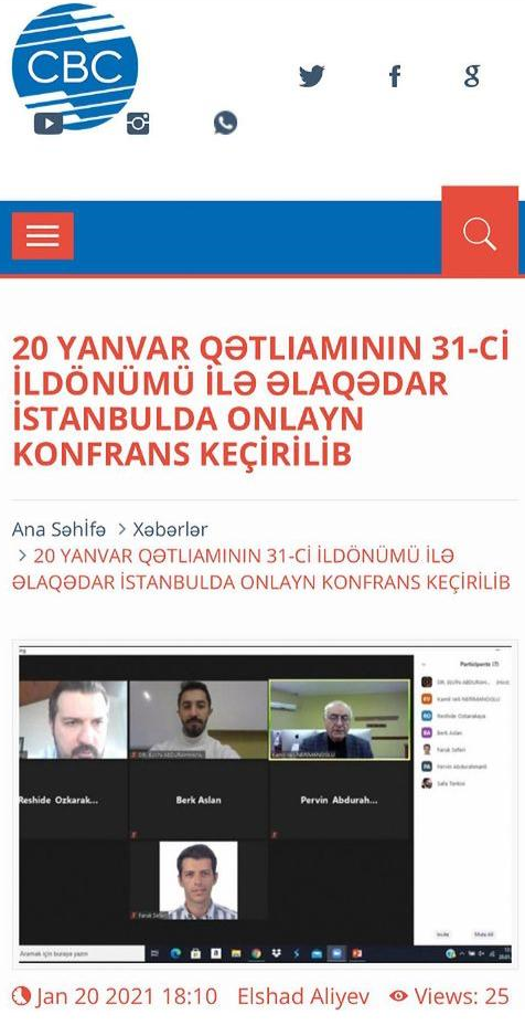 20 Ocak 1990 yılı Katliamının 31. yıldönümü anma proğramını, İstanbul Aydın Üniversitesi Orta Doğu ve Kafkasya Araştırma Merkezinin birlikteliğiyle ve web konferans aracılığıyla gerçekleştirdik.