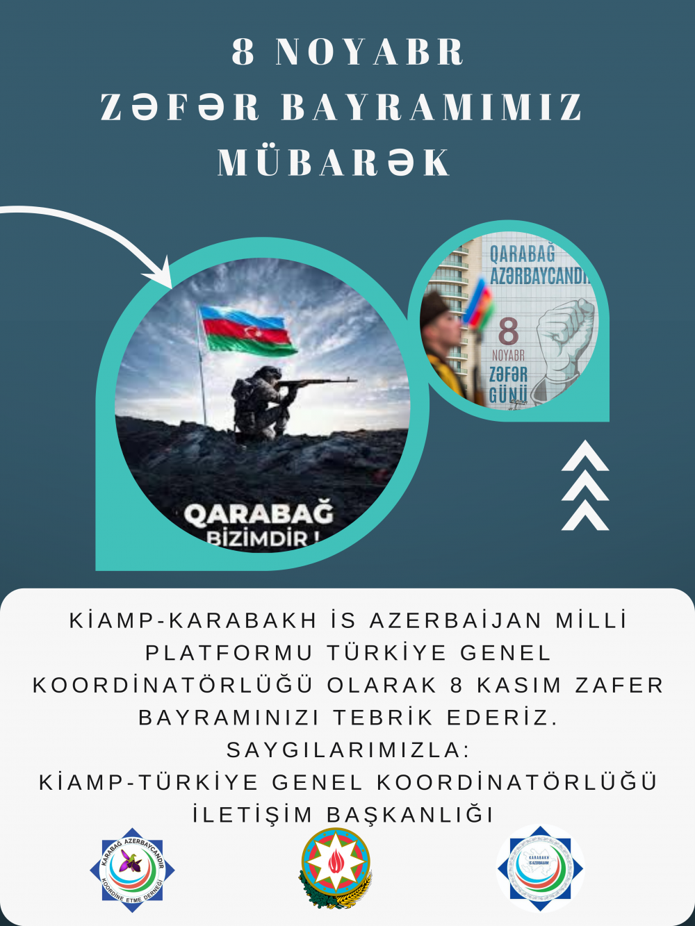 Bizler de Azerbaycan Diaspora Bakanlığının KİAMP-Karabakh is Azerbaijan Milli Platformu Türkiye Genel Koordinatörlüğü, Karabağ Azerbaycandır Koordine Etme Derneği olarak Azerbaycan Halkının 8 Kasım Zafer bayramını kutluyor ve zaferimizin yıl dönümünde Şehitlerimizi rahmet, minnet ve şükranla anıyoruz!