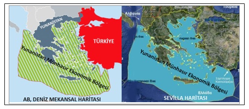 Sevilla Haritası, Güney Kıbrıs'ın ilan ettiği ‘münhasır ekonomik bölge’nin sınırları ile Yunanistan’ın Türkiye ile siyasi çatışma içinde olduğu Adalar Denizi’ndeki sözde münhasır ekonomik Bölgesini AB'nin resmi sınırları olarak kabul ediliyordu ve bu isteklere göre hazırlanmıştı. 1958, 1960 ve 1982 Deniz Hukuku Konvansiyonunun birçok maddesine aykırı olarak ve yasal olarak hak edilmeyen yerleri gasp etmek amacı ile çizilmiş bu harita, “Uluslararası Münhasır Ekonomik Bölge” kurallarını da açıkça çiğnemekte.