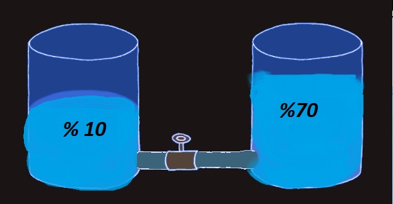 Tabanları bir ve birbirine bağlı iki kap düşünelim. Aralarına musluk takalım. Bir kap zenginleri temsil etsin, öteki kap fakirleri. Zengin kaptaki su oranı %70 fakirlerin temsil ettiği kaptaki su oranı % 10 ise ve devamlı zengin kaptaki su doluyorsa musluğun açılması suyun dengelenmesi gerekir. Yukarıdaki Ceylanın kaçması nereye kadar olur dersiniz?