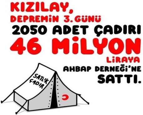 Deprem bölgesinde Kızılay’ın olmadığı eleştirileri üzerine AKP genel başkanı şunu söylemişti: “Terbiyesiz, terbiyesizliğini bırakmaz. Çıkmış bir tanesi ‘Kızılay nerede’ diyor. Be ahlaksız, be namussuz, be adi… Günde 2,5 milyon insana bu Kızılay yemeğini ulaştırıyor. Böyle vicdansızlık olur mu?” Bu söylem hiçbir insana yakışmadığı gibi, devleti yönetenlere hiç yakışmamaktadır; devlet terbiyesi ve ciddiyetiyle bağdaşmamaktadır. Vicdansızlık örneği ise Kızılay’ın depremin üçüncü gününde, deposundaki 2050 çadırı 46 milyon TL karşılığında AHBAP derneğine satmasıdır. Deprem günü depremzedelere gönderilmesi gereken çadırlar, üç gün sonra satılmıştır. Böylece kimlerin ‘ahlaksız, namussuz, adi’ olduğu ortaya çıkmıştır.