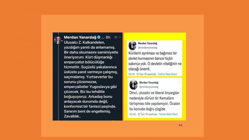 Yanar döner Merdan Yanardağ, 'Türk Milleti' tanımını savunmuyor ama konu Kürt kökenli vatandaşlarımız olunca, her türlü algı ve yanıltıcı mesaj için medyada yarış yapmaktadır. Tam bağımsız Türkiye Cumhuriyeti’ni bölmek amaçlı BOP projesine hizmet eden emperyalizmin işbirlikçileriyle aynı hizaya girdiği anlaşılmaktadır. Çözüm diye sunulan bu ihanet sürecine destek verenler asla yurtsever olamaz.