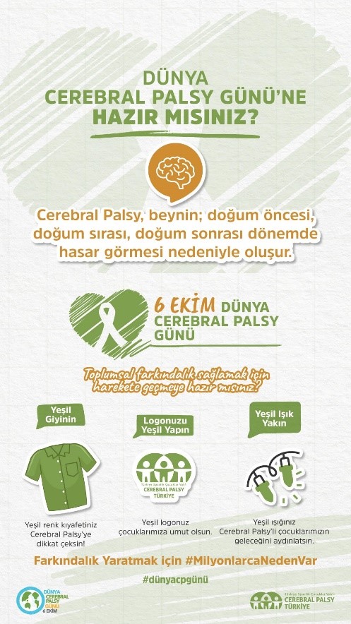 Cerebral palsy her yıl 6 ekimde filizlenme, hayat ve hayatın yenilenmesi anlamına gelen “yeşil” renkli kıyafetlerle sosyal medya paylaşımlarının yanı sıra çeşitli etkinliklerle “fark ettirilmeye” çalışılıyor.