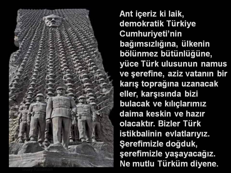Yapılan ant metni, 1961 tarihli İç Hizmet Kanunu’nda yer alan resmi bir metindir ve şöyledir: “Ant içeriz ki laik, demokratik Türkiye Cumhuriyeti’nin bağımsızlığına, ülkenin bölünmez bütünlüğüne, yüce Türk ulusunun namus ve şerefine, aziz vatanın bir karış toprağına uzanacak eller, karşısında bizi bulacak ve kılıçlarımız daima keskin ve hazır olacaktır. Bizler Türk istikbalinin evlatlarıyız. Şerefimizle doğduk, şerefimizle yaşayacağız. Ne mutlu Türküm diyene.” Her askerin silahlı kuvvetlere katılırken içtiği bu ant metnine nasıl karşı çıkılır?