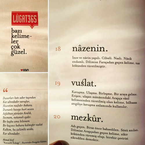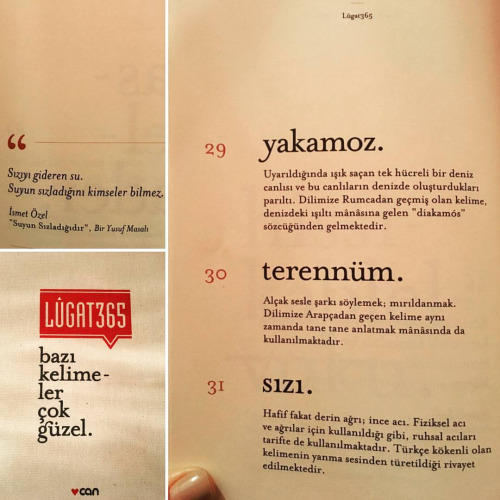 Lügat365 (bazı kelimeler çok güzel) isimli bir kitap... Unutulmakta olan 365 kelimenin tekrar can bulduğu bir kitap. Bu kitaptan alıntıydı başta yazdığım kelimeler, anlamlarını da kısa kısa aldım yazımın altına ben, kitapta biraz daha uzun anlatılmış.