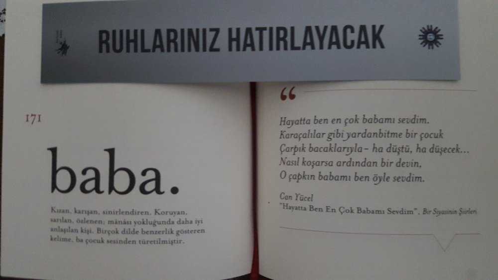 Hediye seremonisinin en can alıcı noktası, "kitapta ayracı koyduğum yer önemli" demişti hediyesini verirken oğlum.  Tabii ki ayracı koyduğu sayfayı açtım ben de ve açtığın gibi de kelimelerin en babası ile karşılaşmam bir oldu: BABA...