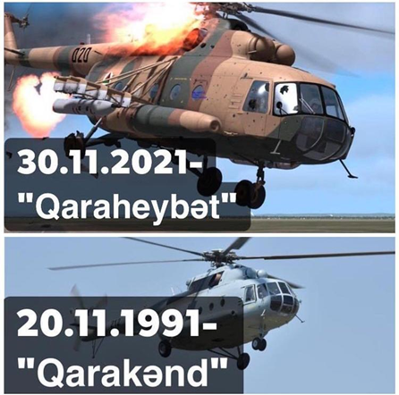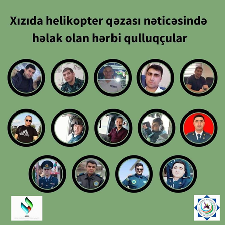 30 Kasım 10:40 saatlerinde Azerbaycan'ın Hızı şehrinin Devlet Sınır İdaresi ''Qaraheybet'' Askeri tatbikat bölgesinde Azerbaycan Ordusunun Askeri Helikopterinin kazaya uğraması sonucu 14 vatan evladı hayatını kaybetmiştir 2'si de yaralanmıştır.