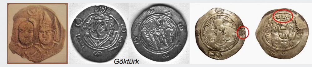Orta Asya Türk tarihinin eldeki en eski paraları Göktürkler tarafından bastırılmış olan 576–600 yıllarına ait sikkelerdir. Yukarıdaki resimde görülen ilk sikkelerin üzerinde Yeni Ay ve karşısında altı köşeli yıldız bulunmaktadır.