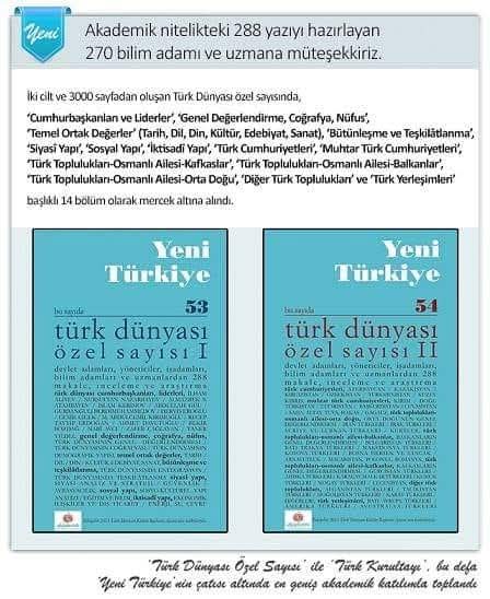 Türkiye’nin yakından tanıdığı siyaset ve kültür adamı Hasan Celal Güzel bir gün aniden telefonla aradı. Yeni Türkiye Dergisi’nin son sayısında konunun “Türk Dünyası” olduğunu ve bir makale yazmamı istedi. Ben de seve seve kabul ettim. “Güneydoğu Avrupa’(Balkanlar)da Türk İzleri” konulu bir makale yazdım. Ortaya iki cilt, 288 yazı ve 3000 sayfadan oluşan muhteşem bir yayın ortaya çıkmış. Mutlaka alın ve okuyun, kütüphanenizde bulunsun. Emeği geçenlere sonsuz teşekkürler...