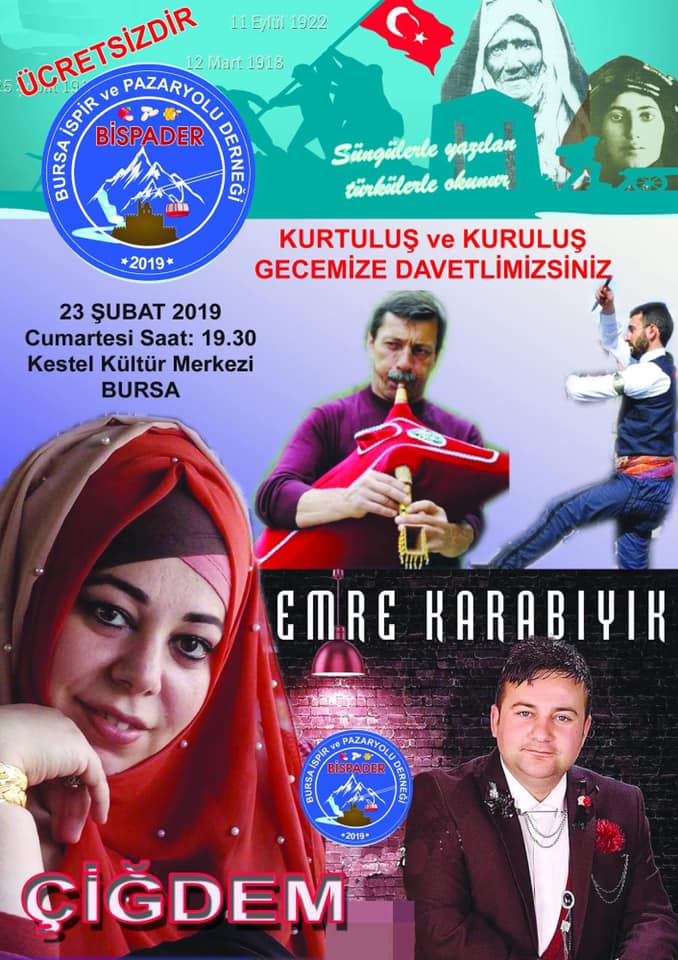 Bursa'daki etkin Anadolu Derneklerinden BİSPADER "Bursa İspir ve Pazaryolu Derneği" 23.02.2019 günü "Kurtuluş ve Kuruluş Gecesi" etkinliği düzenledi.