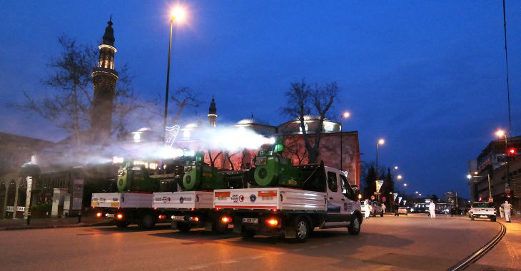 Çin’de ortaya çıkan, tüm dünyayı etkisi altına alan ve Türkiye’de de ölümlere yol açan ‘Covid 19’ salgınına karşı ilk günden itibaren yoğun bir çalışma başlatan Bursa Büyükşehir Belediyesi özellikle dezenfeksiyon çalışmalarını kesintisiz sürdürüyor. Sağlık İşleri Dairesi Başkanlığı Veteriner Hizmetleri Şube Müdürlüğü tarafından yürütülen, 32 araç, 82 ekipman ve 69 personelle yapılan çalışmalarda, yerli ve yabancı turistlerin uğrak yeri olan sultan külliyeleri, tarihi çarşı ve hanlar, türbeler selatin camileri, kamu kurumları, otobüs durakları, toplu taşıma araçları, taksi ve dolmuşlar ve alt geçitler periyodik olarak dezenfekte ediliyor.