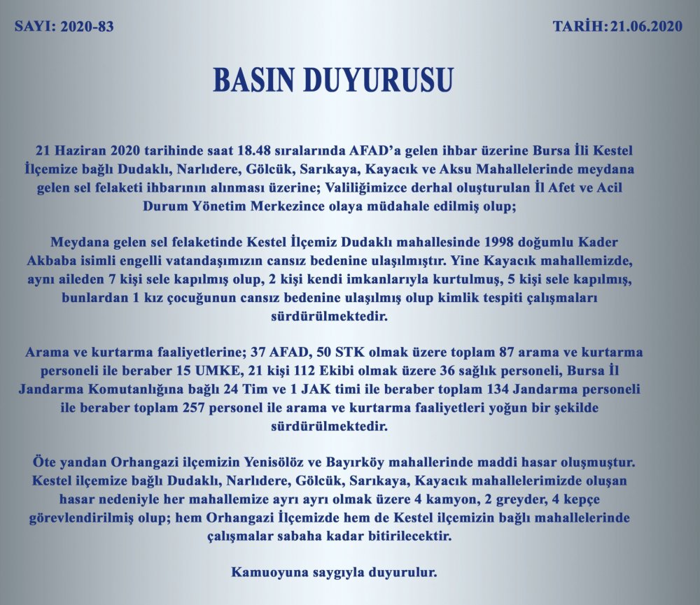 “Kayacık Mahallesi’nde aynı aileden 7 kişi sele kapılırken 2 kişi kendi imkanlarıyla kurtulmuş, 5 kişi sele kapılmış, bunlardan 1 kız çocuğunun cansız bedenine ulaşılmış olup kimlik tespiti çalışmaları sürdürülmektedir. Arama ve kurtarma faaliyetlerine 37 AFAD, 50 STK olmak üzere toplam 87 arama ve kurtarma personeli ile beraber 15 UMKE, 21 kişi 112 Acil Servis ekibi olmak üzere 36 sağlık personeli, Bursa Jandarma Komutanlığına bağlı 24 tim ve 1 JAK timi ile beraber toplam 134 jandarma personeli ile toplam 257 personelle arama ve kurtarma faaliyetleri yoğun bir şekilde sürdürülmektedir.