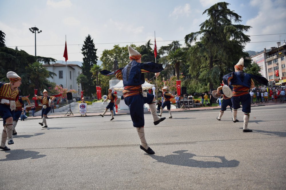 Etkinlikler, Atatürk anıtı önünde kurulan platformda devam etti. Burada yapılan törende Bursa Ali Osman Sönmez Sosyal Bilimler Lisesi öğrencisi Feyza Yaman ile Bursa Atatürk Lisesi öğrencisi Enes Dürüst günün önemini anlatan şiirler okudu. Osmangazi Belediyesi halk oyunları ekibi ve Nilüfer Belediyesi halk oyunları ekibinin dans gösterileri de izleyenlerden alkış aldı. Bursa Mehteran Takımı ve Tahtakıran Kılıç Kalkan ekibinin gösterilerinin ardından Zafer Bayramı kutlamaları, Atatürk Caddesi’nde yapılan kortej geçişiyle son buldu.
