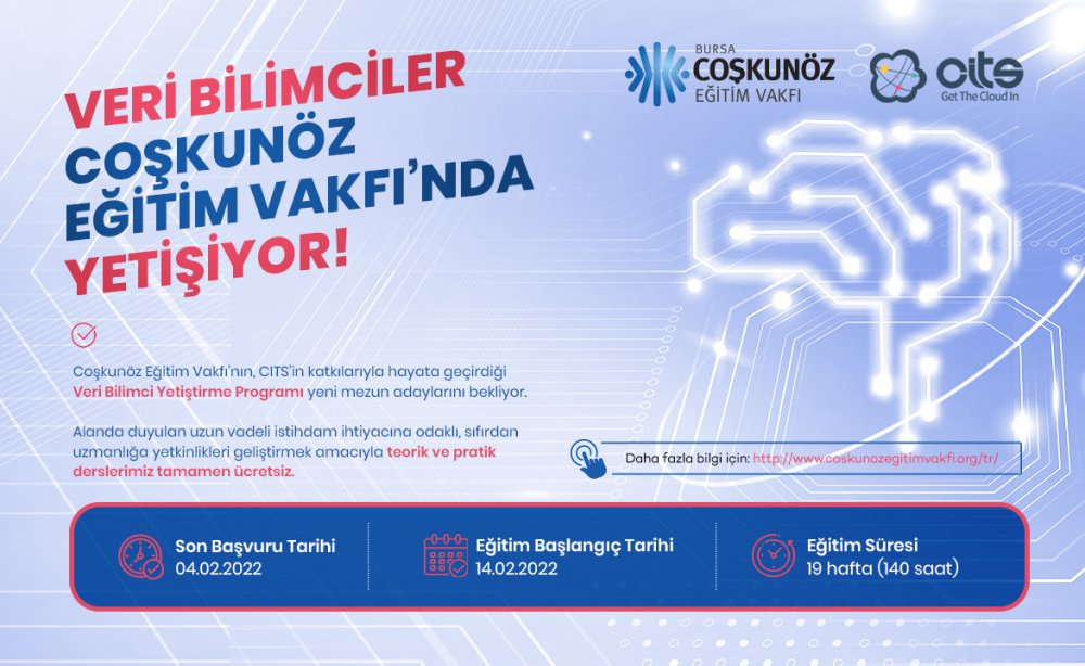 Programa başvurular 4 Şubat 2022 tarihine kadar https://www.coskunozegitimvakfi.org/tr/projeler/veri-bilimci-yetistirme-programi linki üzerinden gerçekleştirilebilir.