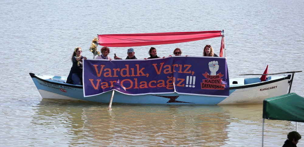 8 Mart Dünya Kadınlar Günü kapsamında Gölyazı’da buluşan kadınlar, mor çiçekler ekip, kayıklarla açıldıkları gölde pankart açarak haklarına dikkat çekti.