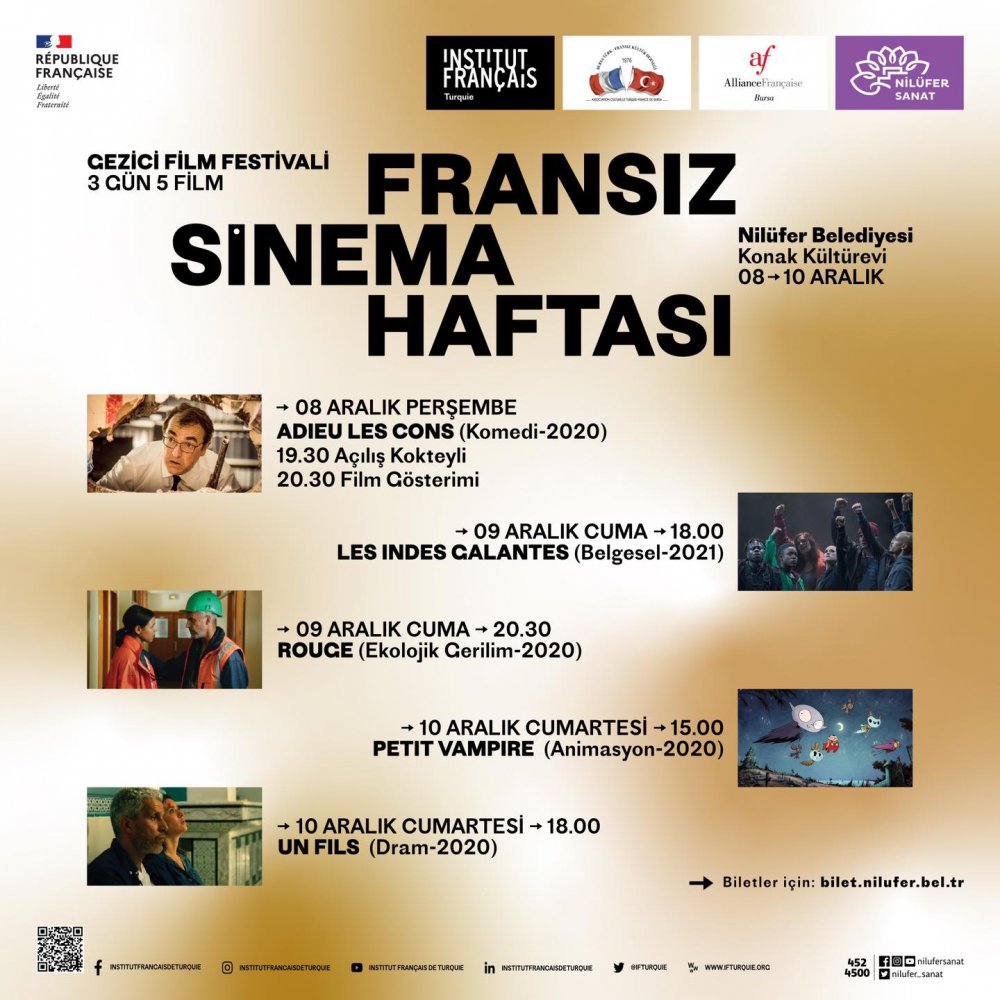 Nilüfer Belediyesi’nin İnstitut français Türkiye ve Bursa Türk-Fransız Alliance Française Kültür Derneği ile birlikte düzenlediği Fransız Sinema Haftası, 8-10 Aralık tarihleri arasında Fransız yapımı filmleri, sinema tutkunlarıyla buluşturuyor. Fransız Sinema Haftası çerçevesinde gerçekleştirilen Gezici Film Festivali, birbirinden güzel Fransız filmlerinin Türkçe altyazılı gösterimleriyle, sinemaseverlere şölen yaşatacak. Gezici Film Festivali, Gaziantep, Ankara, Antalya gibi çeşitli illerin ardından Nilüfer Belediyesi’nin ev sahipliğinde, Bursalı sanatseverlerle buluştu. Bu yıl ikincisi gerçekleştirilen festival, Konak Kültürevi’ndeki açılış kokteyli ve komedi türündeki “Adieus les cons” filminin gösterimiyle başladı. Nilüfer Belediye Başkan Yardımcısı Zafer Yıldız ile Bursa Türk-Fransız Alliance Française Kültür Derneği Başkanı Mehmet Erbak’ın da açılışına katıldığı festival, ilk günden beyaz perde tutkunlarının yoğun ilgisiyle karşılaştı.