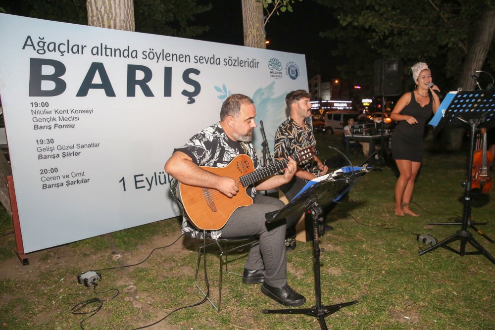 Nilüfer Belediye Başkanı Turgay Erdem’in çağrısıyla kürsüye çıkan Nilüfer Kent Konseyi Gençlik Meclisi üyeleri İlke İzmir ve Sinan Cem Aslandoğan, her yıl Barış Günü kutlamaları yapıldığını, ancak dışarıda değişen bir şey olmadığını ve şiddete, baskıya maruz kalan milyonlarca insan olduğunu ifade ettiler. Gençler, yaptıkları açıklamada şu ifadelere yer verdiler: “Biz gençler karar vericilerden, savaş politikasından arındırılmış, sürdürülebilir yaşamları olan toplumları var etmek için alanlar oluşturmalarını istiyoruz. Her gün haberlerde, sosyal medyada birbiriyle kavga eden siyasiler görmek istemiyoruz, bundan çok sıkıldık. Biz toplumuyla bir arada oturabilen, birbirini dinleyebilen, toplumu için tüm dünya için halkıyla tartışabilen, çözümler üretebilen karar vericiler görmek istiyoruz.”