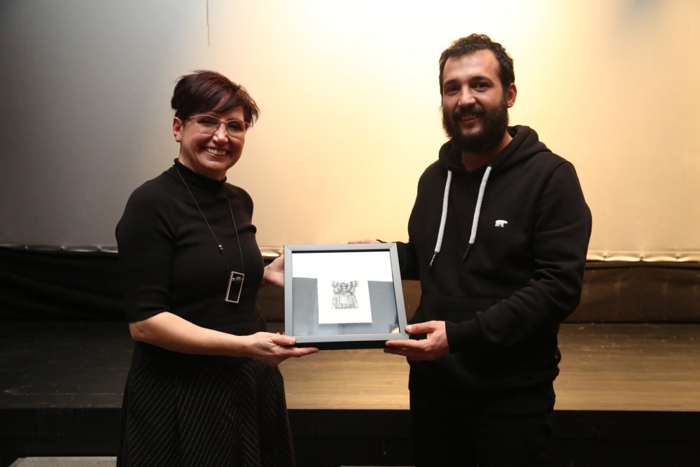 Söyleşinin sonunda Nilüfer Belediyesi Kültür ve Sosyal İşler Müdürü Nejla Aslan, Sen Ben Lenin filminin senaristi ve yönetmeni Tufan Taştan’a günün anısına hediye vererek teşekkür etti.