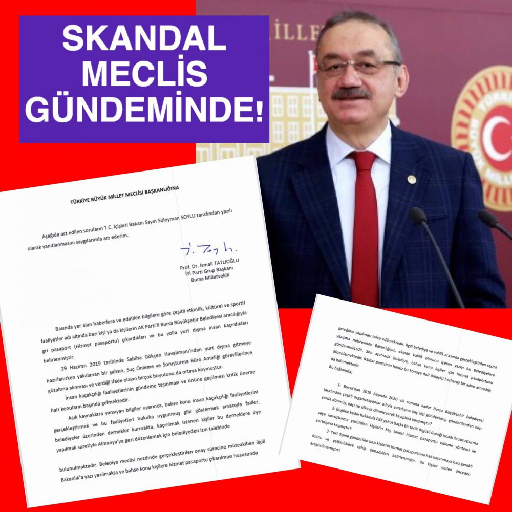 İYİ Parti Meclis Grup Başkanı, Bursa Milletvekili Prof. Dr. İsmail Tatlıoğlu, Bursa Büyükşehir Belediyesi’nin gri pasaport yoluyla ‘insan kaçakçılığı’na alet edilmesi ile ilgili olarak, İçişleri Bakanı Süleyman Soylu’nun yanıtlaması talebiyle, TBMM Başkanlığına soru önergesi verdi.