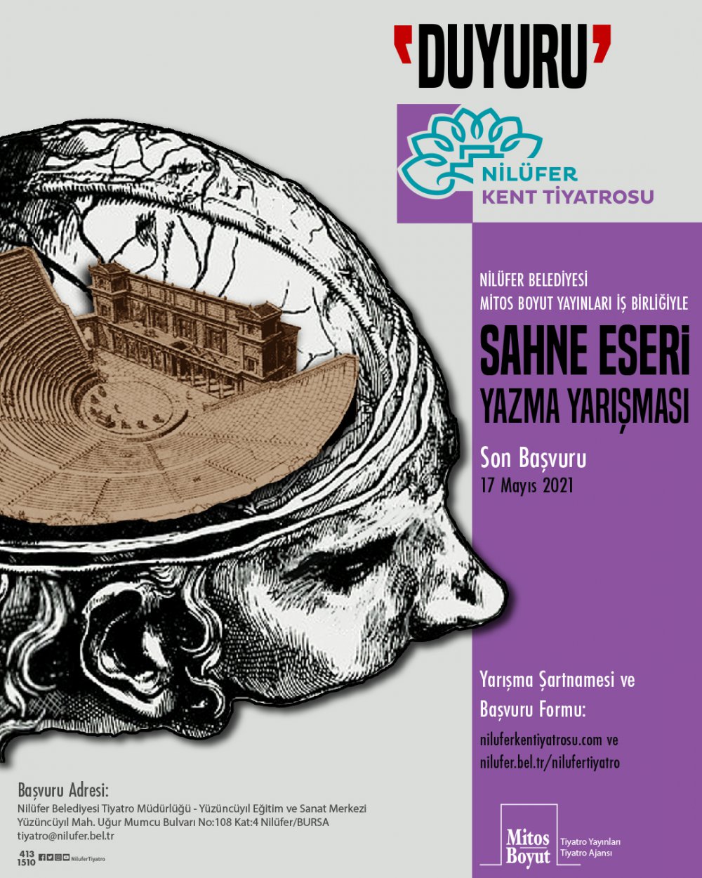 Nilüfer Belediyesi’nin, sanata katkı koymak ve tiyatro oyunları yazmaya teşvik etmek amacıyla Mitos Boyut Yayınları iş birliği ile bu yıl beşinci kez düzenlediği Sahne Eseri Yazma Yarışması’na başvuru süresi 17 Mayıs 2021 tarihine kadar uzatıldı.