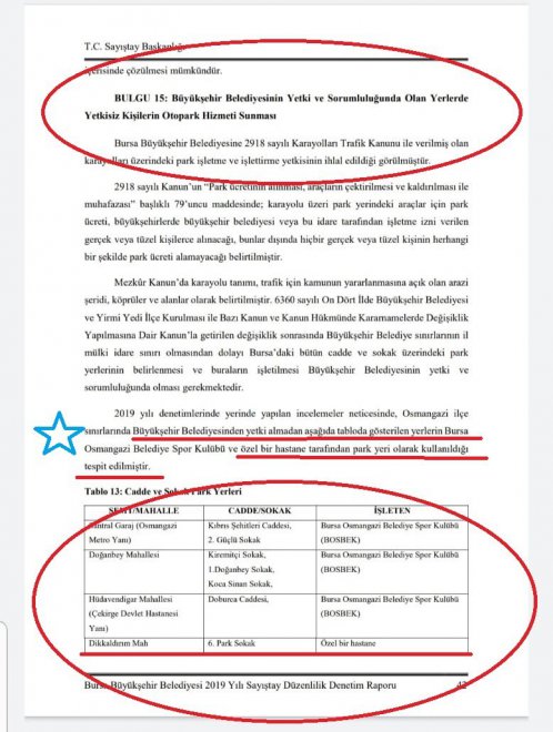 “2019 yılı denetimlerinde yerinde yapılan incelemeler neticesinde, Osmangazi ilçe sınırlarında Büyükşehir Belediyesi’nden yetki almadan aşağıda tabloda gösterilen yerlerin Osmangazi Belediye Spor Kulübü ve özel bir hastane tarafından park yeri olarak kullanıldığı tespit edilmiştir”