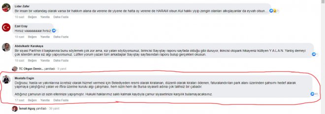 Ak Parti Bursa Milletvekili Mustafa Esgin , İyi Parti İl Başkanı Selçuk Türkoğlu'nun Facaebook sayfasında konu ile alakalı açıklamanın altına bir yorum paylaşarak iddialara cevap verdi. Esgin açıklamasında ''Doğrusu; hasta ve yakınlarına ücretsiz olarak hizmet vermesi için Belediyeden resmi olarak kiralanan,düzenli olarak kiraları ödenen,faturalandırılan park alanı üzerinden şahsımı hedef alarak yapmaya çalıştığınız yalan ve iftira üzerine kurulu algı çalışması ,hem sizin hem de Bursa siyaseti adına çok talihsiz bir çabadır.Attığınız çamurun izi sizin ellerinize yapışmıştır.Hukuki haklarımız saklı kalmak kaydıyla çamur siyasetinize karşılık bulamayacaksınız.'' dedi