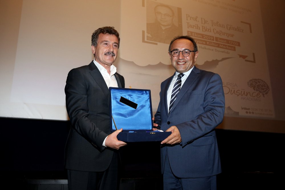 Türkiye’nin önemli düşünce ve bilim insanlarını Bursalılarla buluşturan Büyükşehir Belediyesi’nin Düşünce Akademisi, Prof. Dr. Tufan Gündüz’ün “Tarih Bizi Çağırıyor” semineriyle Tayyare Kültür Merkezi’nde başladı. Hacettepe Üniversitesi Türkiyat Araştırmaları Enstitüsü Öğretim Üyesi Prof. Dr. Tufan Gündüz, Bursalıların yoğun ilgi gösterdiği programda, Göktürklerden bugüne Türklerin tarih sahnesindeki konumunu anlatırken, toplumları ayakta tutan şeylerin moral değerler olduğunu vurguladı. Toplumların kendini mutlu etmek için her zaman pozitif noktalara bakmak istediğini hatırlatan Gündüz, “Genellikle büyük şahsiyetler, kahraman hükümdarlar ve büyük zaferler hatırlanır. ‘Bugünkü imkânlarınız ve donanımızla tarihin hangi döneminde olmak istersiniz?’ desem, büyük çoğunluk Kanuni dönemi, Yavuz dönemi veya İstanbul’un Fethi’nde bulunmak istiyorum.’ der. Bunlar zaten parlak dönemler. Neden bugünkü imkânlarla gideyim, Genç Osman’ın hayatını kurtarayım, diye kimsenin aklına gelmez? Çünkü toplumsal psikoloji böyledir. Yüksek moral veren yerde bulunmak isteriz. Buna tarihî derinlik diyoruz. Derinliği arttıkça moral değer artıyor.” dedi.