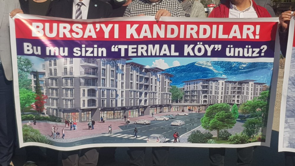 -Bursa’nın ve Bursalılar’ın bir kez daha kandırıldığını söyleyen Türkoğlu, “Bu bölgedeki yapıları istimlak ederlerken, ortaya büyüleyici bir proje koydular ve Termal Köy müjdesi verdiler. Meğer, 690 adet konut, 92 adet de dükkan yapacaklarmış. Bunlar inşaat rantıyla kafayı bozdular” şeklinde konuştu.