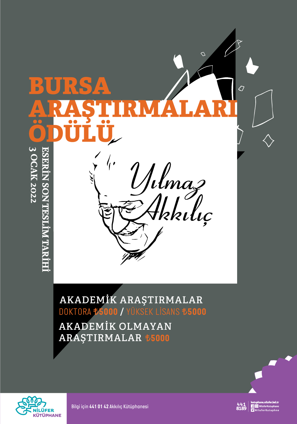 Bursa’nın doğal ve kültürel varlıkları ile tarihsel, sosyal ve ekonomik süreçlerinin incelenip araştırılmasını özendirmek amacıyla 2010 yılından bu yana verilen Yılmaz Akkılıç Bursa Araştırmaları Ödüllerine bugüne kadar doktora tezi, yüksek lisans tezi, akademi dışı olmak üzere toplam 371 eser başvuruda bulundu. Başarı ödülüne ya da seçici kurul özel ödülüne değer bulunan toplam 40 yapıt Nilüfer Belediyesi Akkılıç Kütüphanesi tarafından yayımlanarak okuyucu ile buluşturuldu. Yılmaz Akkılıç Bursa Araştırmaları Başarı Ödülü’ne değer bulunan yapıtlar, kütüphanenin titiz editörlüğü ile baskıya hazırlanıp yayınlanıyor. Yapıt sahibine başarıyı belgeleyen bir plaket ve çalışmasına katkı olarak 5 bin lira parasal ödül veriliyor. Ayrıca özel ödüle değer bulunan yapıtların da kitaplaştırılıp okuyucuya ulaşması sağlanıyor.