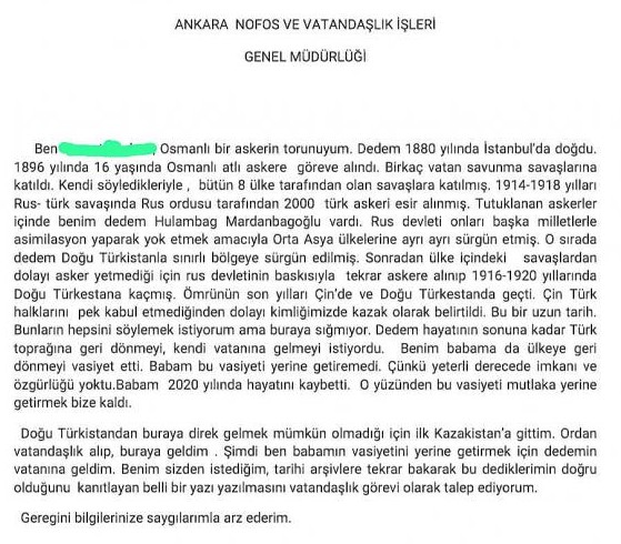 İçişleri Bakanlığı Nüfus ve Vatandaşlık idaresine, Genel Kurmay başkanlığına, müracaatta bulundu. Müracaatlarına olumlu cevap alamadan Kazakistan’a döndü.