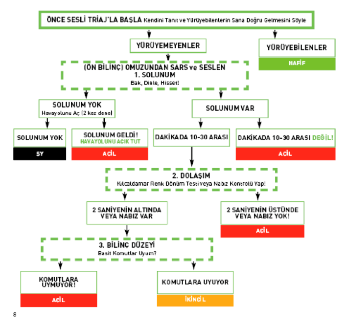 Olay yerinde birden fazla yaralının olduğu durumlarda, tüm yaralıları hızla değerlendirerek, öncelikli olarak yardıma gereksinimi olan yaralıları belirlemeli (triyaj/ayırma),