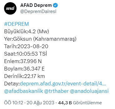 Sabah saat 10:05'de Kahramanmaraş'ın Göksun ilçesi merkezli 4,2 büyüklüğünde ve yerin 22.17 km derinliğinde bir deprem meydana geldi.