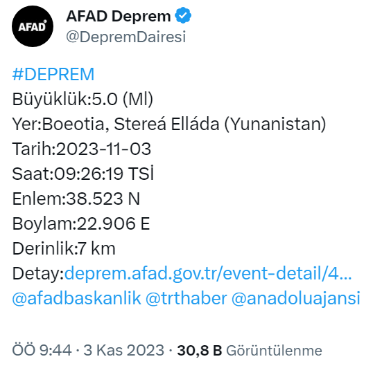 AFAD'ın bildirdiğine göre, bugün sabah 09.26 civarında Yunanistan'da 5 büyüklüğünde bir deprem meydana geldi.