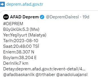 Boğaziçi Üniversitesi Kandilli Rasathanesi ve Deprem Araştırma Enstitüsü kayıtlarına göre az önce saat:20:48'de merkezi Malatya'nın Yeşilyurt ilçesi olan bir deprem meydana geldi.