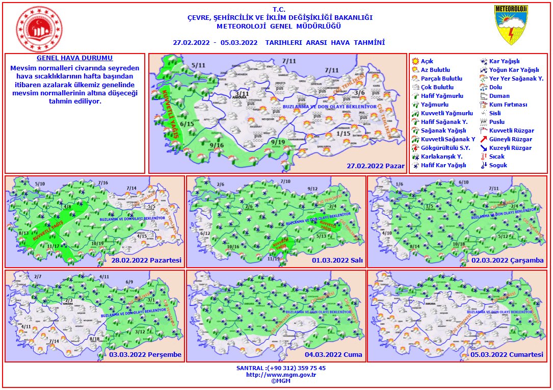 Haftalık Hava Tahmini (27 Şubat – 5 Mart 2022) Mevsim normalleri civarında seyreden hava sıcaklıklarının hafta başından itibaren azalarak ülkemiz genelinde mevsim normallerinin altına düşeceği tahmin ediliyor.