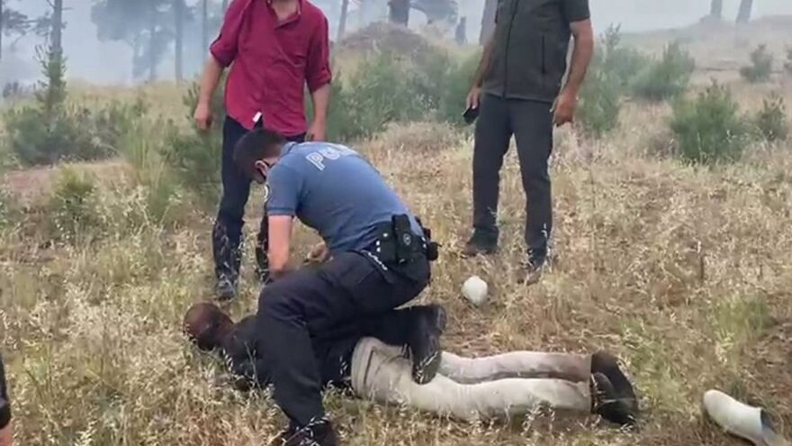 Yangın, havadan ve karadan müdahale edilerek kontrol altına alınmaya çalışılırken şahsın suçüstü yakalanma anı görüntülendi.