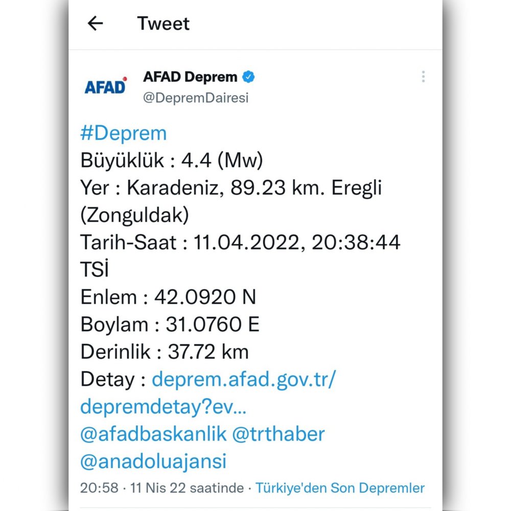 Bu akşam saat: 20:38'de, Zonguldak açıklarında denizin 2 kilometre derinliğinde ve 4.4 büyüklüğünde bir deprem yaşandı.