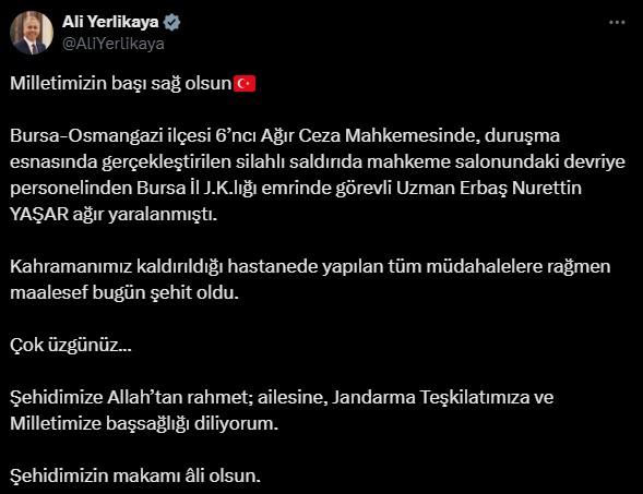 Bursa Adliyesi'nde 6. Ağır Ceza Mahkemesi'nde görülen bir davanın duruşmasında silahlı saldırı sonrası 2 kişinin olay yerinde hayatını kaybettiği 2 jandarmanın yaralandığı olayda yaralı jandarmalardan Uzman Erbaş Nurettin Yaşar hayatını kaybetti. Duruşmada yaşanan silahlı saldırıya ilişkin haberlere yayın yasağı getirilmişti.