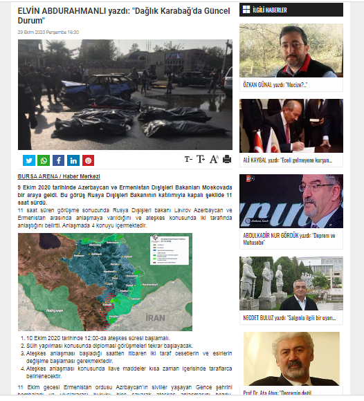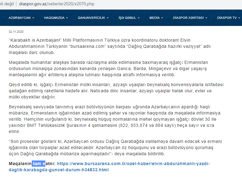 Azerbaycan Diaspora Bakanlığı Türkiye Koordinatörü Dr Elvin ABDURAHMANLI'nın Dağlık Karabağ Sorunu hakkında BURSA ARENA E'GAZETE'de yayınlanan açıklama ve analizi, Azerbaycan Diaspora Bakanlığı'nın devlet resmi web sitesinde öne çıkan haberler arasında yer aldı.