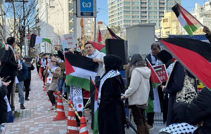 Japonya'da farklı sivil toplum örgütlerinin mensupları, Tokyo'nun Çiyoda ilçesinin Hanzomon bölgesindeki İsrail Büyükelçiliğinin yer aldığı caddenin girişinde bir araya geldi. Yoğun güvenlik önlemleri alan emniyet güçleri, kargaşa ihtimaline karşı, büyükelçiliğin bulunduğu caddeye girişe izin vermedi.