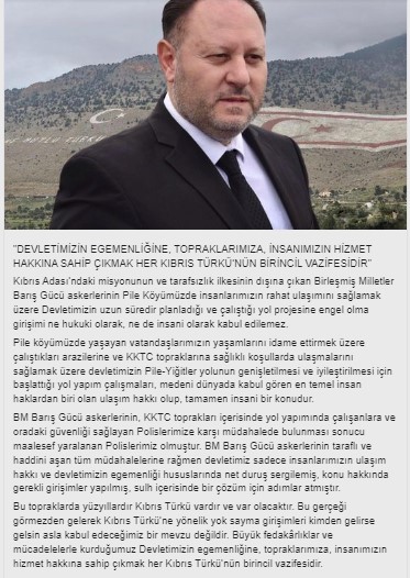 UBP Milletvekili Ziya Öztürkler, BM Barış Gücü’nün KKTC topraklarında Pile-Yiğitler yolunun yapımına müdahalesini protesto ederek, “Devletimizin egemenliğine, topraklarımıza, insanımızın hizmet hakkına sahip çıkmak, her Kıbrıs Türkünün birincil vazifesidir" dedi.
