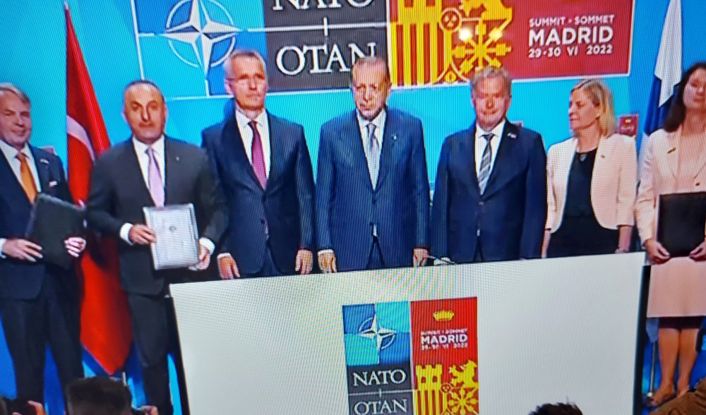 NATO Genel Sekreteri Stoltenberg'in ev sahipliğinde ve basına kapalı yapılan görüşmeden sonra (Türkiye, İsveç ve Finlandiya arasında) Finlandiya ve İsveç'in NATO üyelik süreçleri hakkında bir üçlü protokol imzalandı.
