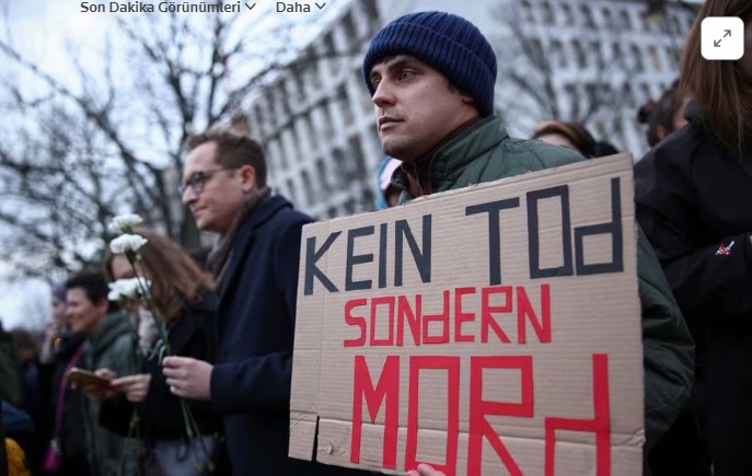 Almanya'nın Berlin kentindeki Rusya Büyükelçiliği önünde düzenlenen anma töreninde bir adam, "Ölüm değil cinayet" yazılı pankart taşıyor