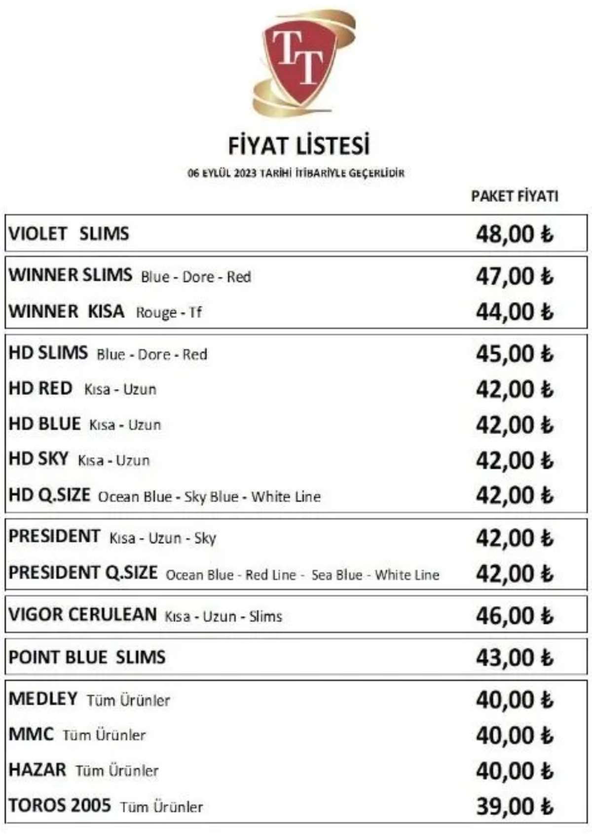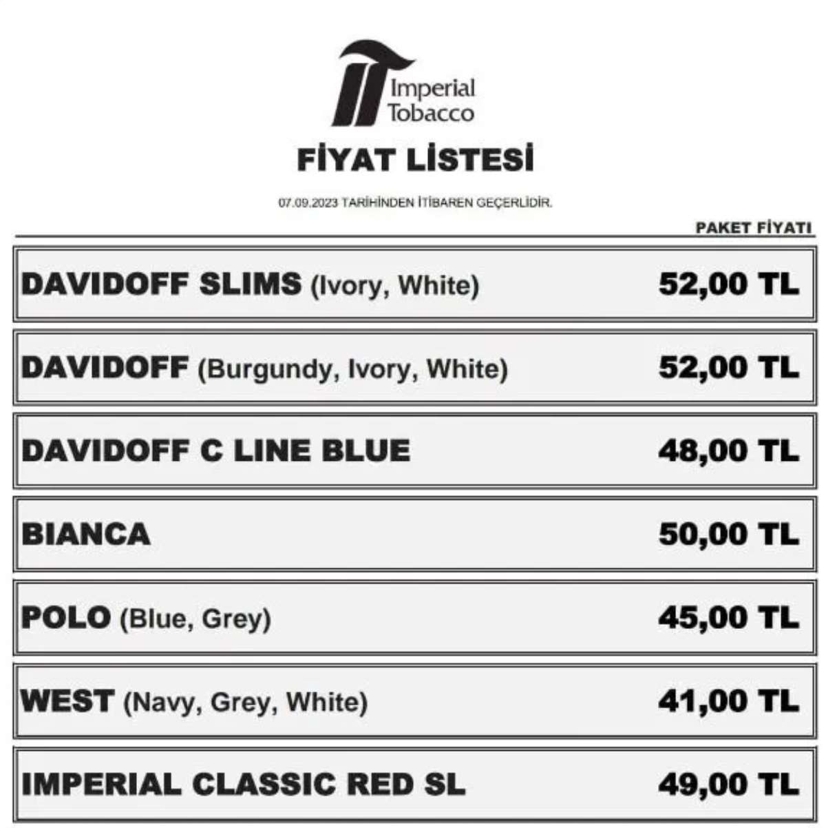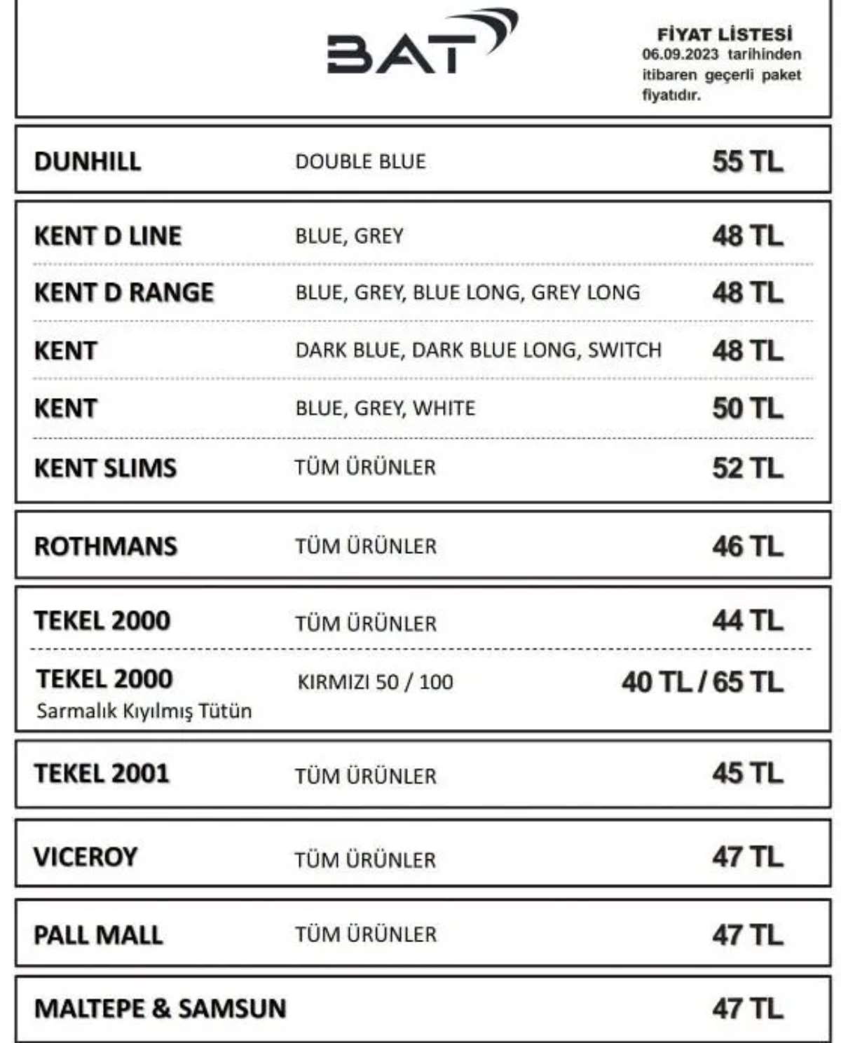6 Eylül itibariyle BAT sigara fiyatları listesi ve T&T sigara fiyat listesi, 7 Eylül tarihinden itibaren ise İmperial Tobacco sigara fiyat listesi zamlandı.