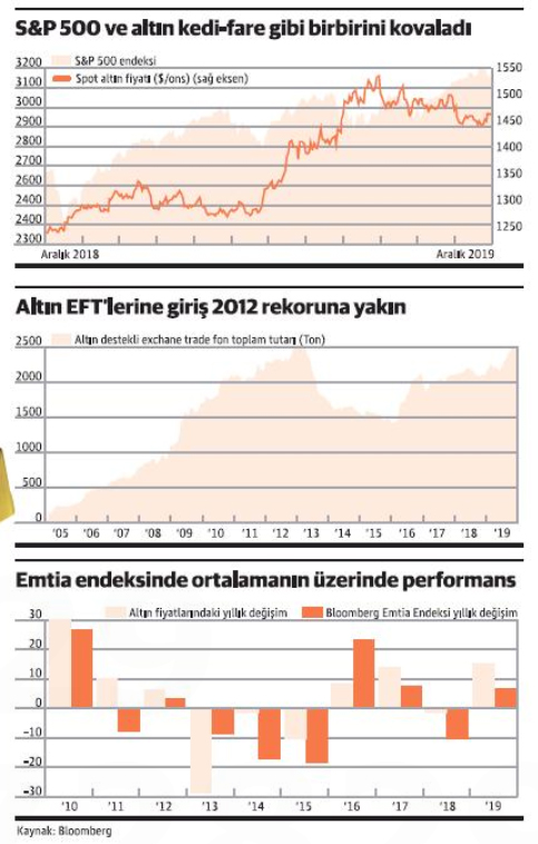 Dünya Gazetesi'nden Hilal Sarı'nın analizine göre; Borsalarda kırılan rekorlar, rekor düzeydeki hisse fiyatları, ticaret savaşlarındaki gerilimin ‘ilk faz’ anlaşması ile bir nebze hafiflemesi altın fiyatlarındaki yükselişi yavaşlatmadı. Altın yılın son günlerinde 1,500 doların üzerindeki yerini sağlamlaştırdı. Altın EFT’leri 2012 yılındaki rekor düzeye yaklaştı. Aralık 2018’de onsu 1.250 doların altında işlem gören altın fiyatı 2019’un son gününde 1,524 dolara kadar yükseldi. Uzmanlar altının son on yılın en güçlü yıllık yükselişlerden birine hazırlandığını ve 2020’de fiyatların yükselmeye devam edeceğini öngörüyor.