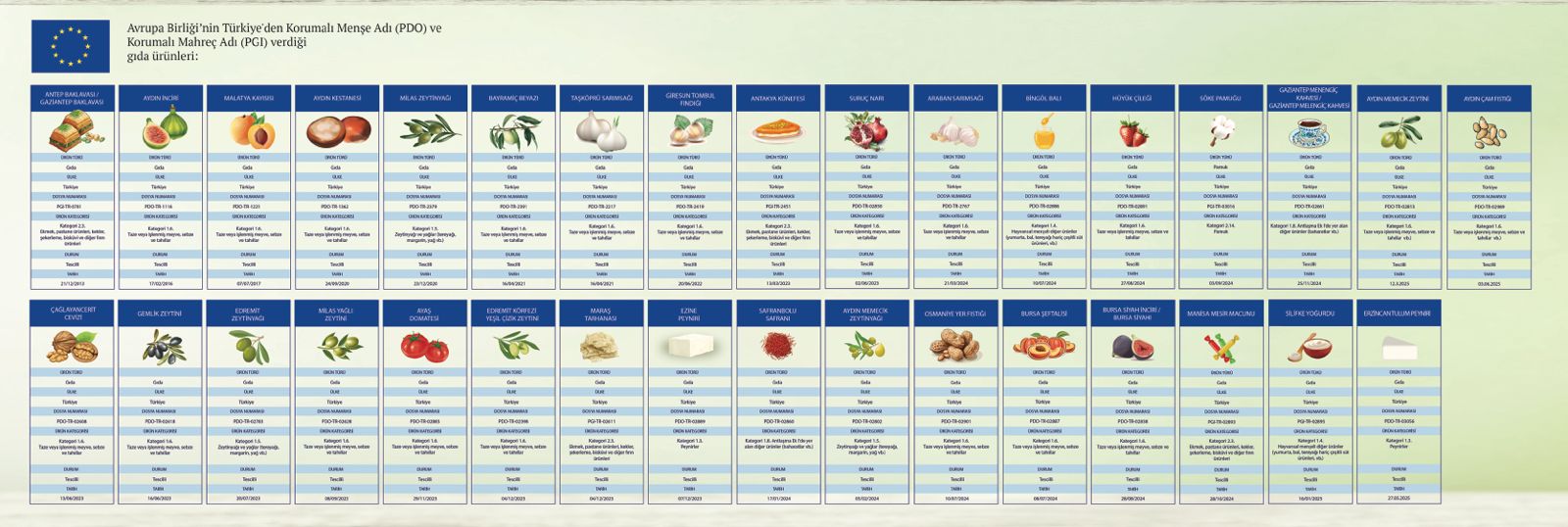 AB’nin Türkiye’den PDO ya da PGI (Korumalı Mahreç Adı) statüsü verdiği ürün isimleri Malatya kayısısı, Milas zeytinyağı, Taşköprü sarımsağı, Giresun tombul fındığı, Antakya künefesi, Suruç narı, Çağlayancerit cevizi, Gemlik zeytini, Edremit zeytinyağı, Milas yağlı zeytini ve Ayaş domatesi, Edremit Körfezi yeşil çizik zeytini, Maraş tarhanası, Ezine peyniri, Safranbolu safranı, Aydın memecik zeytinyağı, Araban sarımsağı, Bingöl balı, Osmaniye yer fıstığı, Bursa şeftalisi, Hüyük çileği, Bursa siyah inciri/Bursa Siyahı, Söke pamuğu, Manisa mesir macunu, Gaziantep menengiç kahvesi / Gaziantep melengiç kahvesi, Silifke yoğurdu, Aydın memecik zeytini ve Aydın çam fıstığı. |