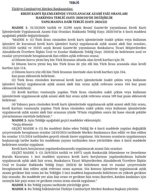 Merkez Bankası'nca çıkartılan Kredi Kartı İşlemlerinde Uygulanacak Azami Faiz Oranları Hakkında Tebliğde Değişiklik Yapılmasına Dair Tebliği Resmi Gazetede yayınlandı.