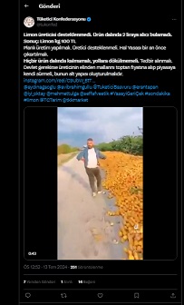 Tüketici Konfederasyonu'nun sosyal medya hesabından yayınlanan açıklamasında, limonun dalında 2 liraya alıcı bulamadığı, fakat marketlerde kilogram fiyatının 100 TL'yi bulduğu belirtildi.