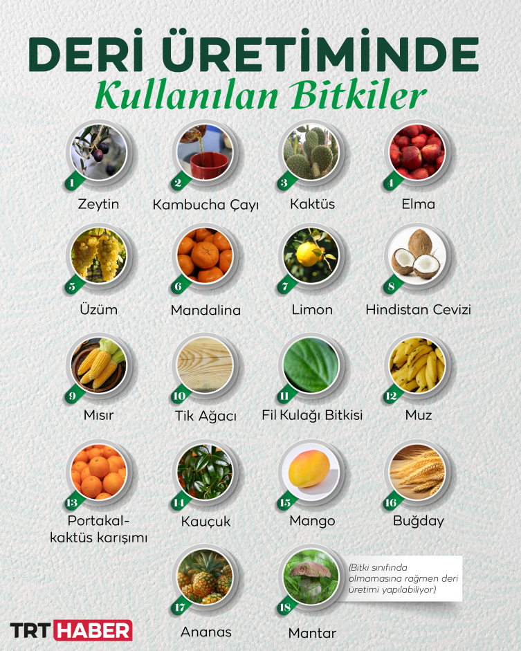 Bitki olmamasına rağmen mantardan da deri üretimi mümkün. Zeytin posası, ananas yaprağının lifleri, mısır ve muz atıkları gibi bitkisel kaynaklar, geçirilen işlemlerle deriye dönüştürülüyor. Sürdürülebilir deri alternatifi olarak tüketiciye sunuluyor hatta teşvik etmek için moda haftaları düzenleniyor.
