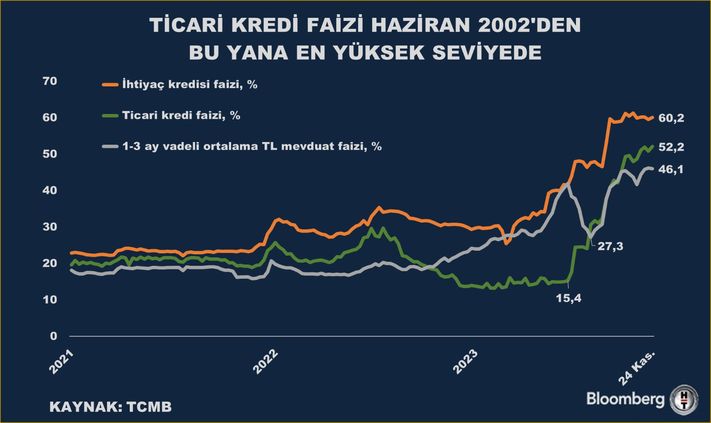TCMB verilerine göre 24 Kasım haftası itibariyle ortalama ticari kredi faizi yüzde 52,19 seviyesine çıktı. Böylelikle ticari kredi faizlerinde 2002’den bu yana en yüksek seviye kaydedildi.